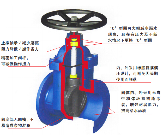 由于閥體內部以無毒性環氧樹脂涂裝,閥瓣的內外表面均以橡膠完全披覆而不至于出現銹水或腐蝕現象,