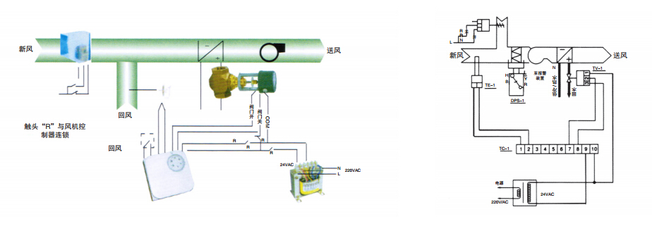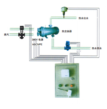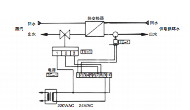 本系統應用于供暖系統的熱交換器控制。通過安裝于循環水管上的 TE-1 溫度傳感器實時檢測溫度。反饋給 TC-1 溫度控制由控制器設定 值與傳感器信號比較。輸出相應的電壓控制信號,控制 TV-1 的蒸汽量。 控制熱交換器的交換熱能,實現供暖循環的溫度恒定。